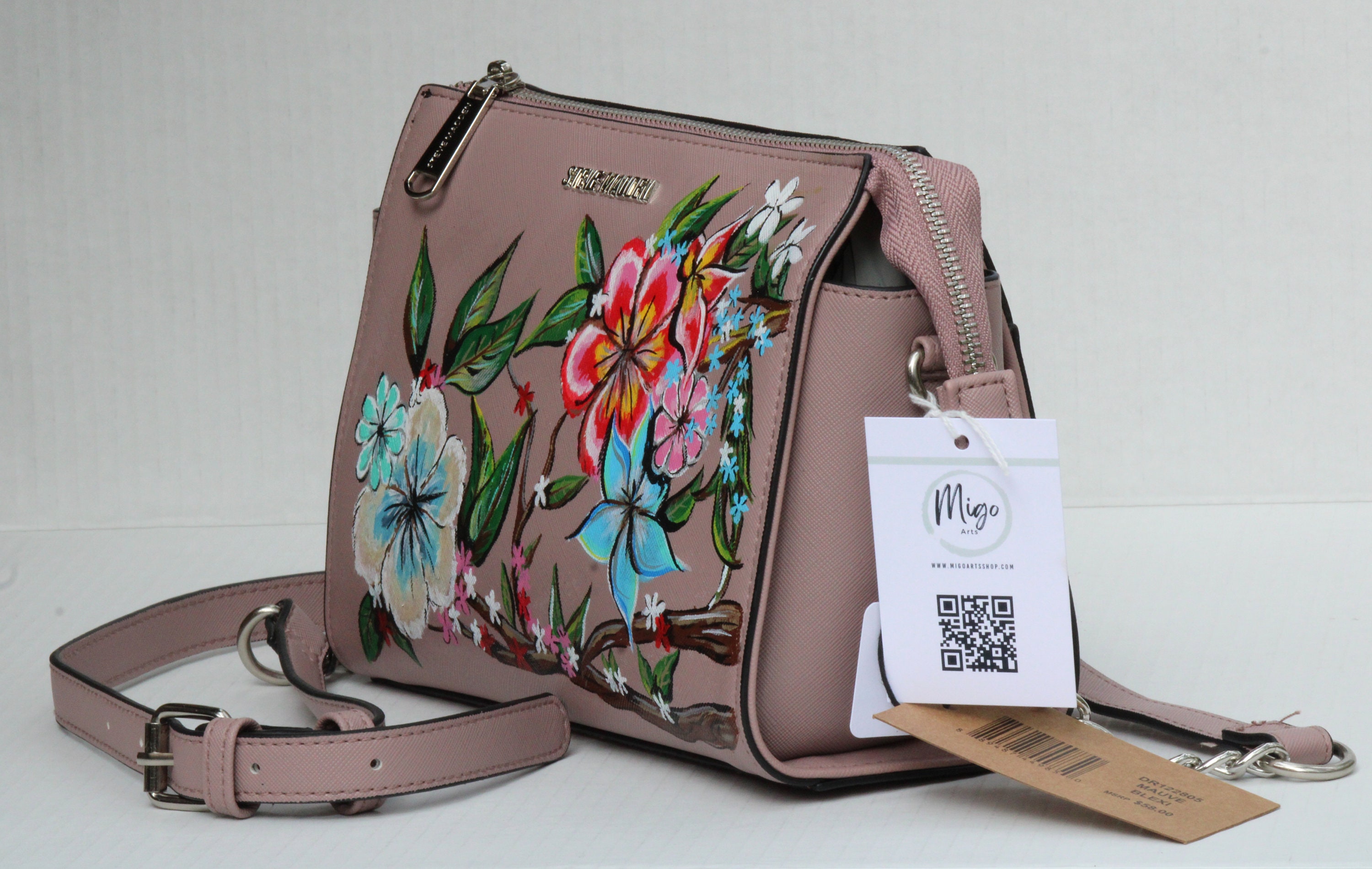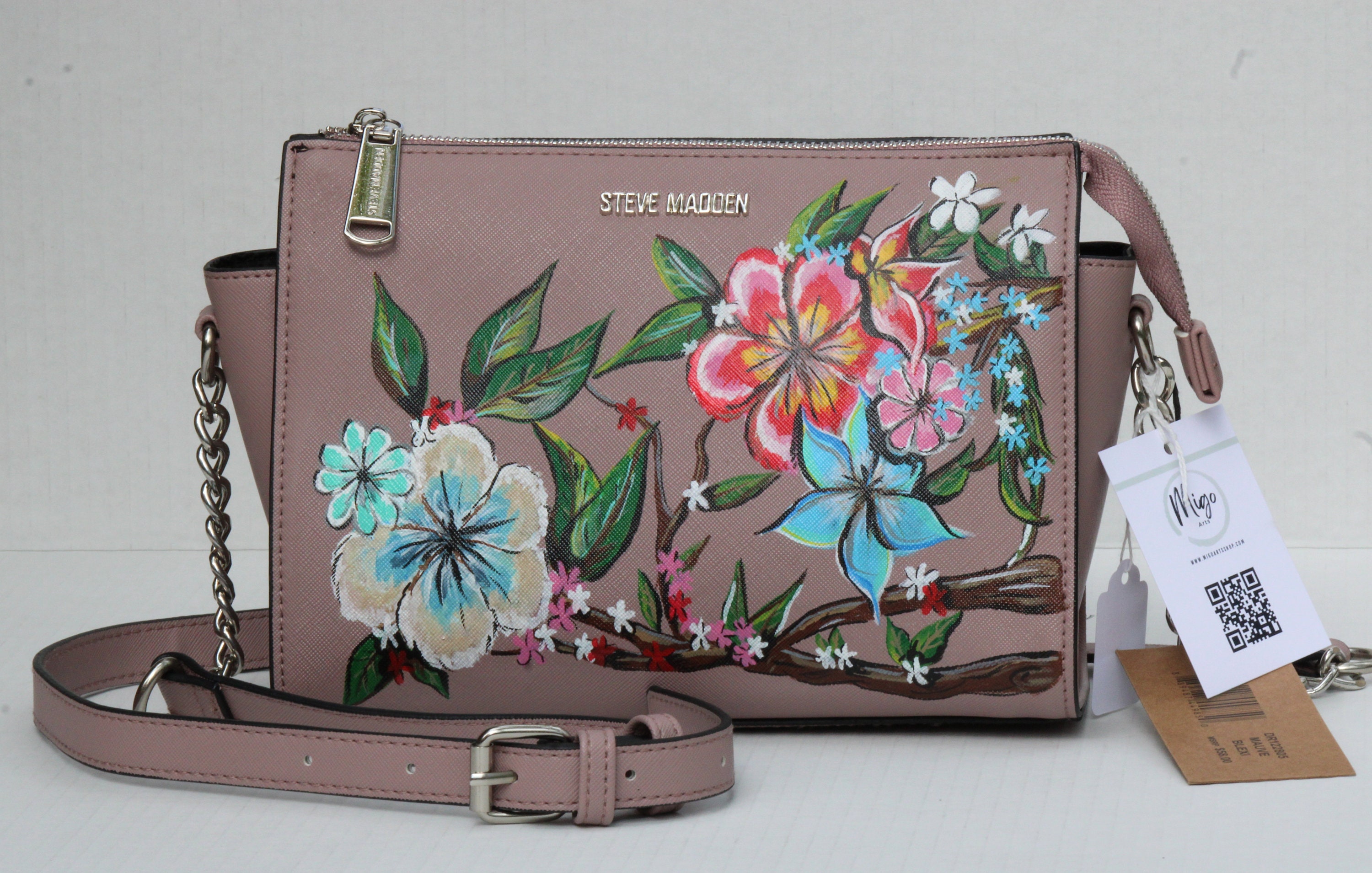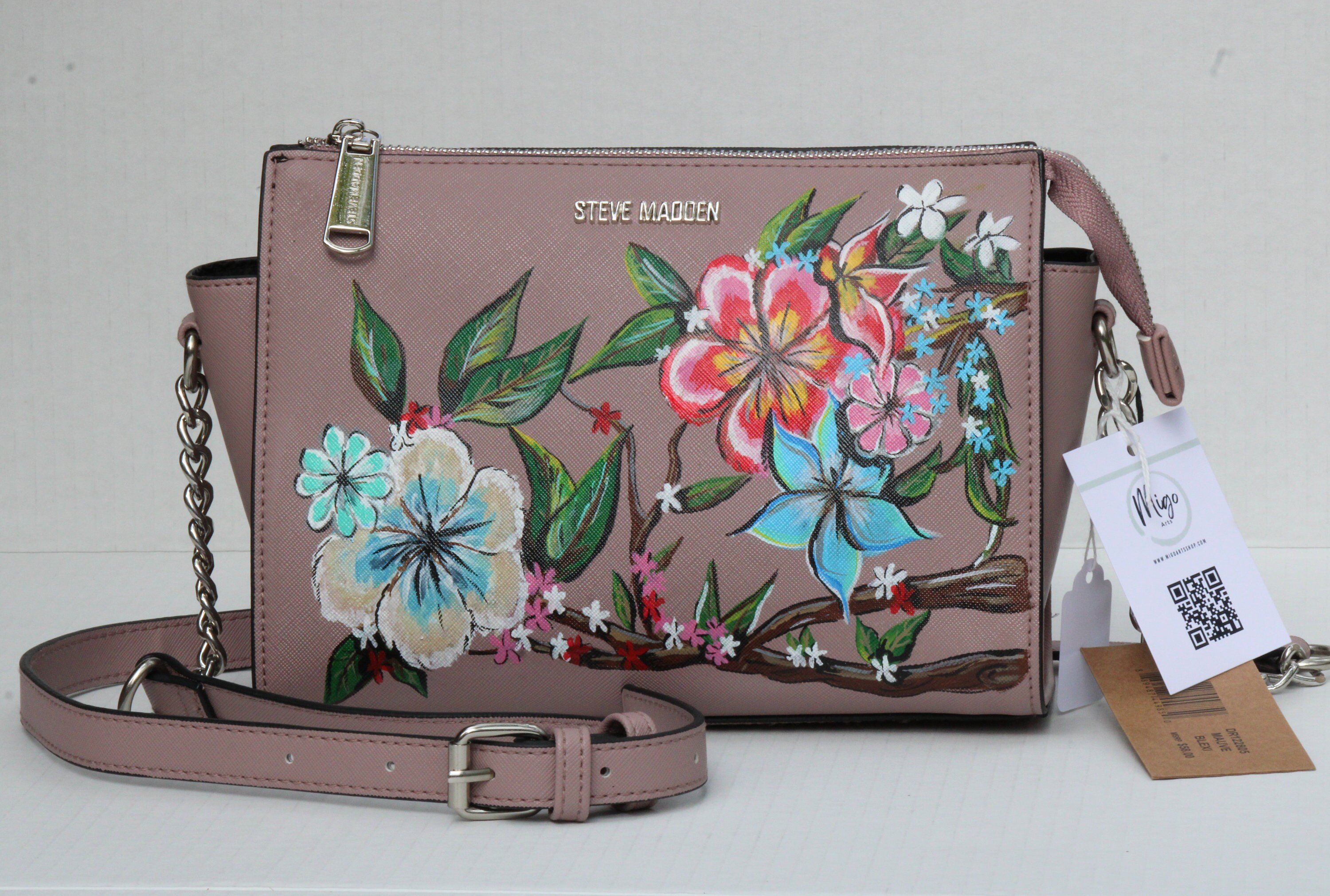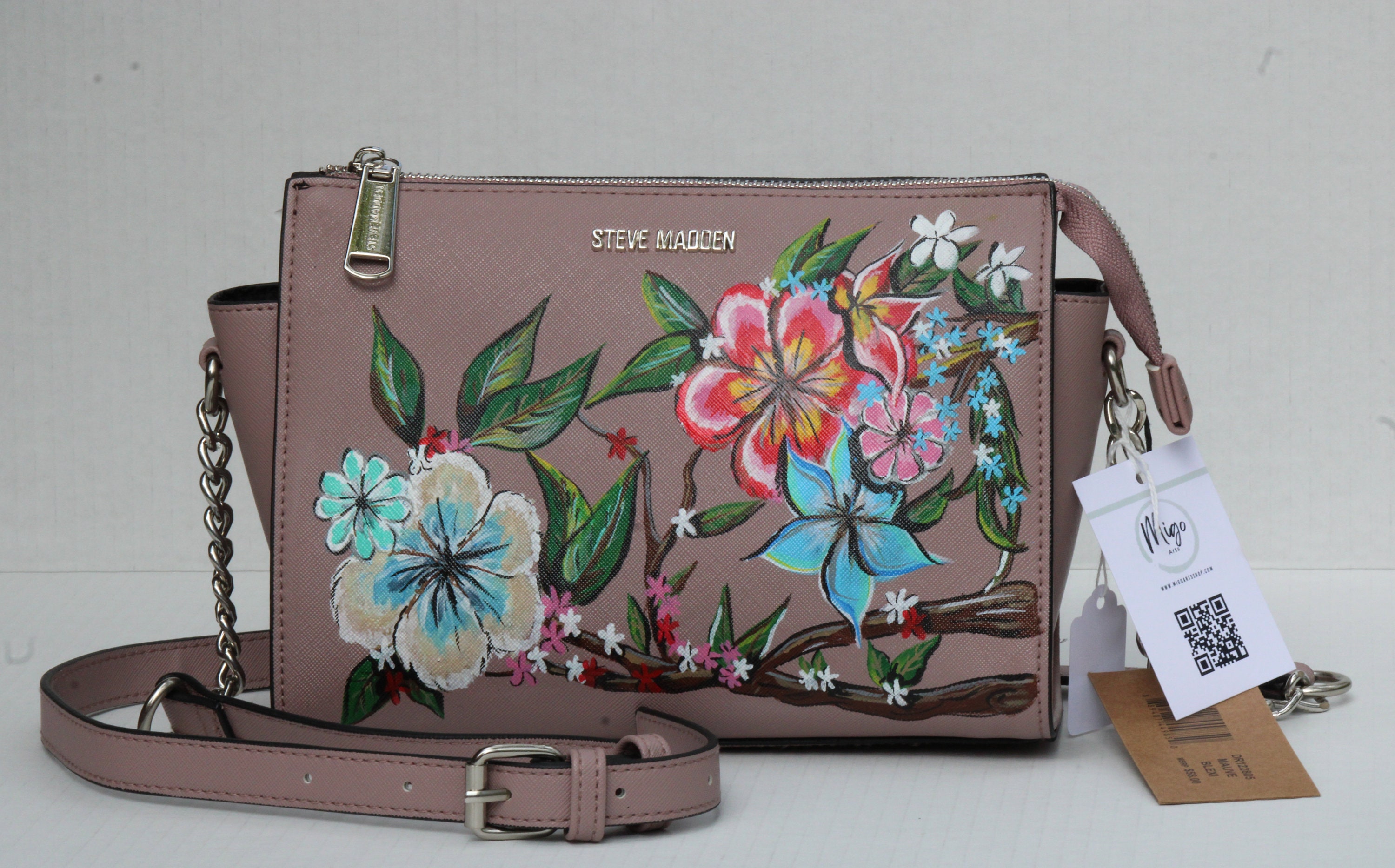 A Vegan Leather bag with painted floweraHIGH quality leather paints and high quality Vegan Leather.Paint is totally cuatomized with you choice. Paints are sealedThe bag is wide from inside ans meduim size