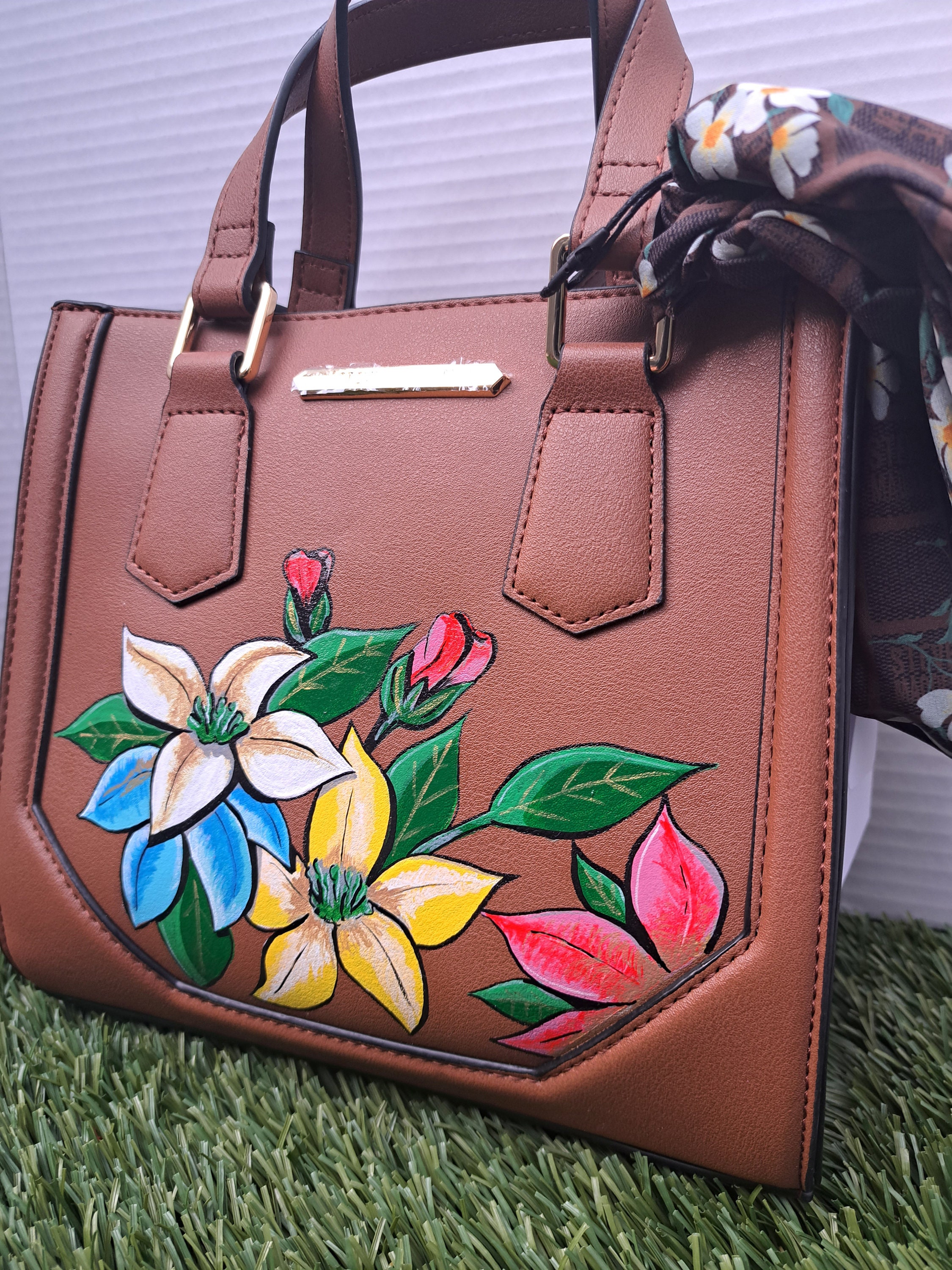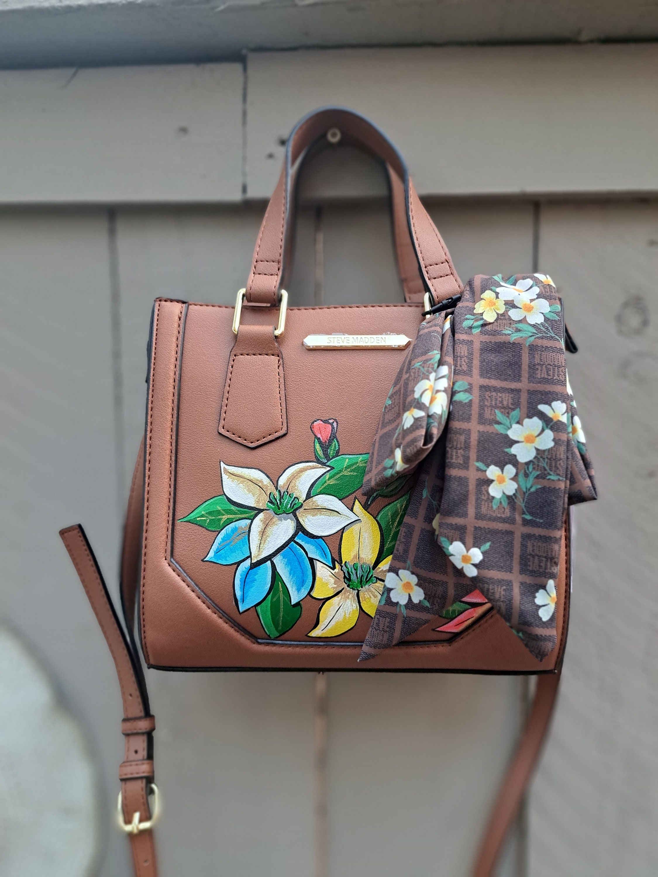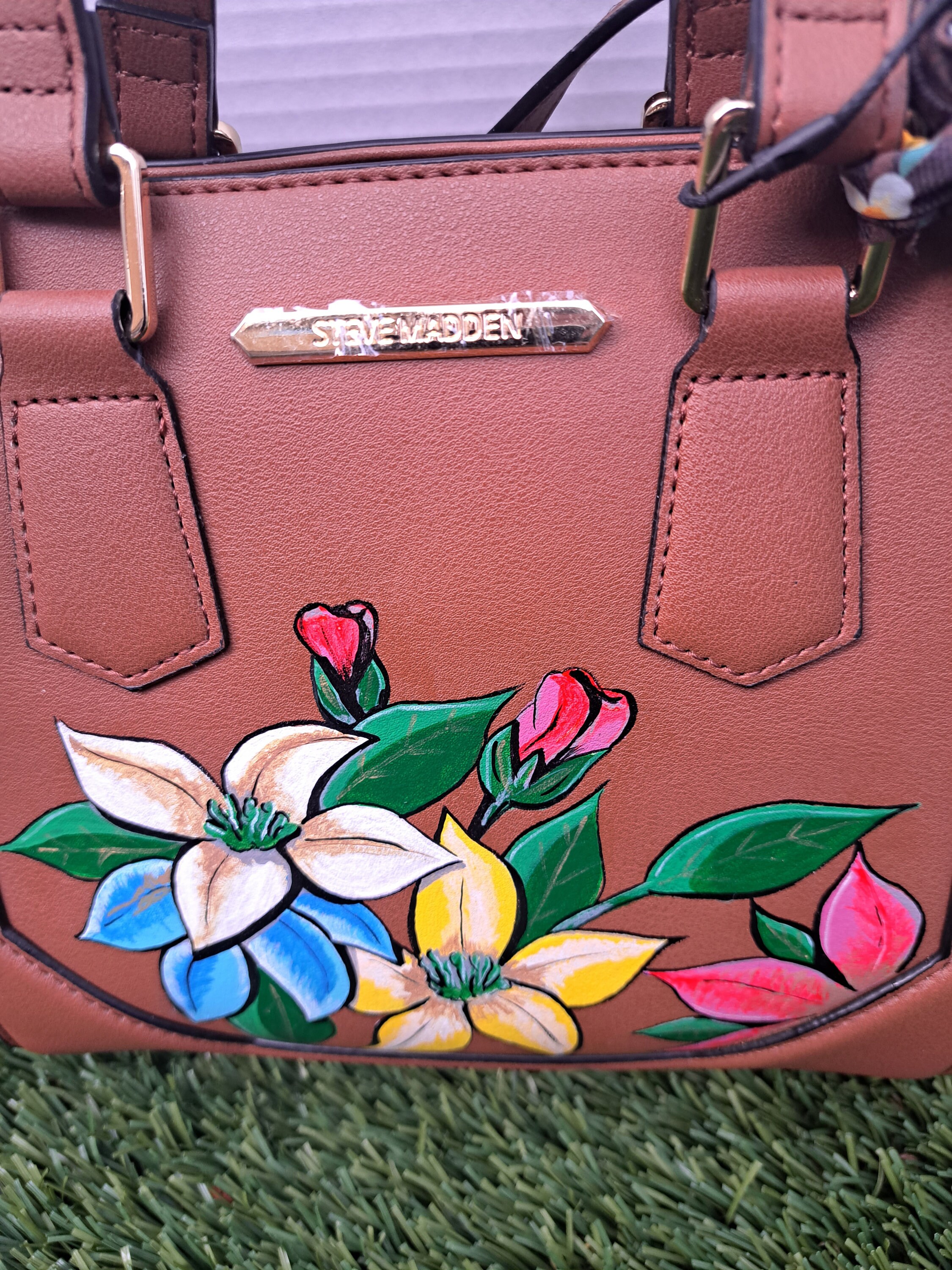 Crafted with the utmost care, this Flower Handbag is made with high-quality leather and a Steve Madden Leather bag, ensuring durability and longevity. The leather handbag features a cognac color that complements the painted spring flowers perfectly, making it an ideal spring designer bag.