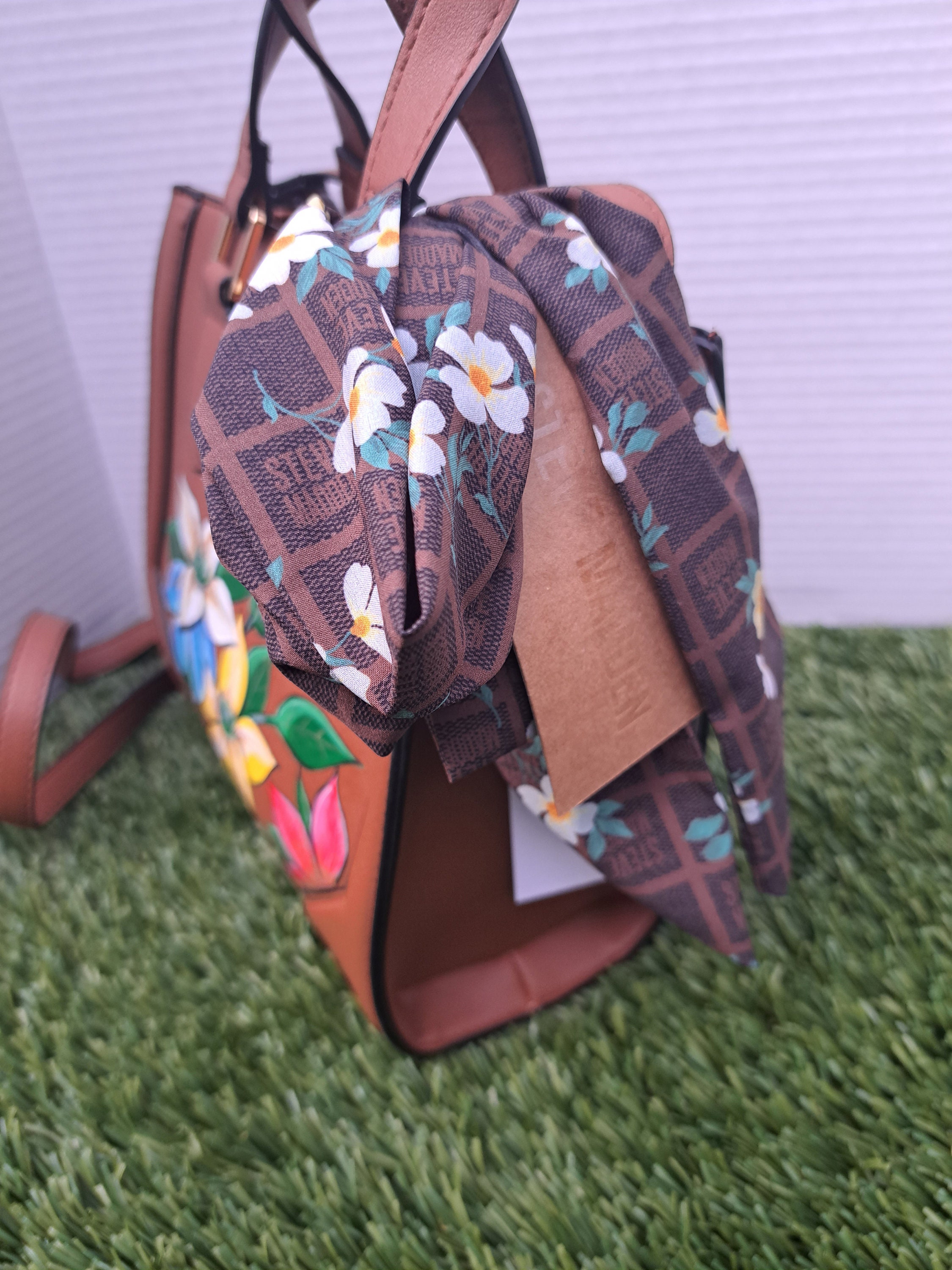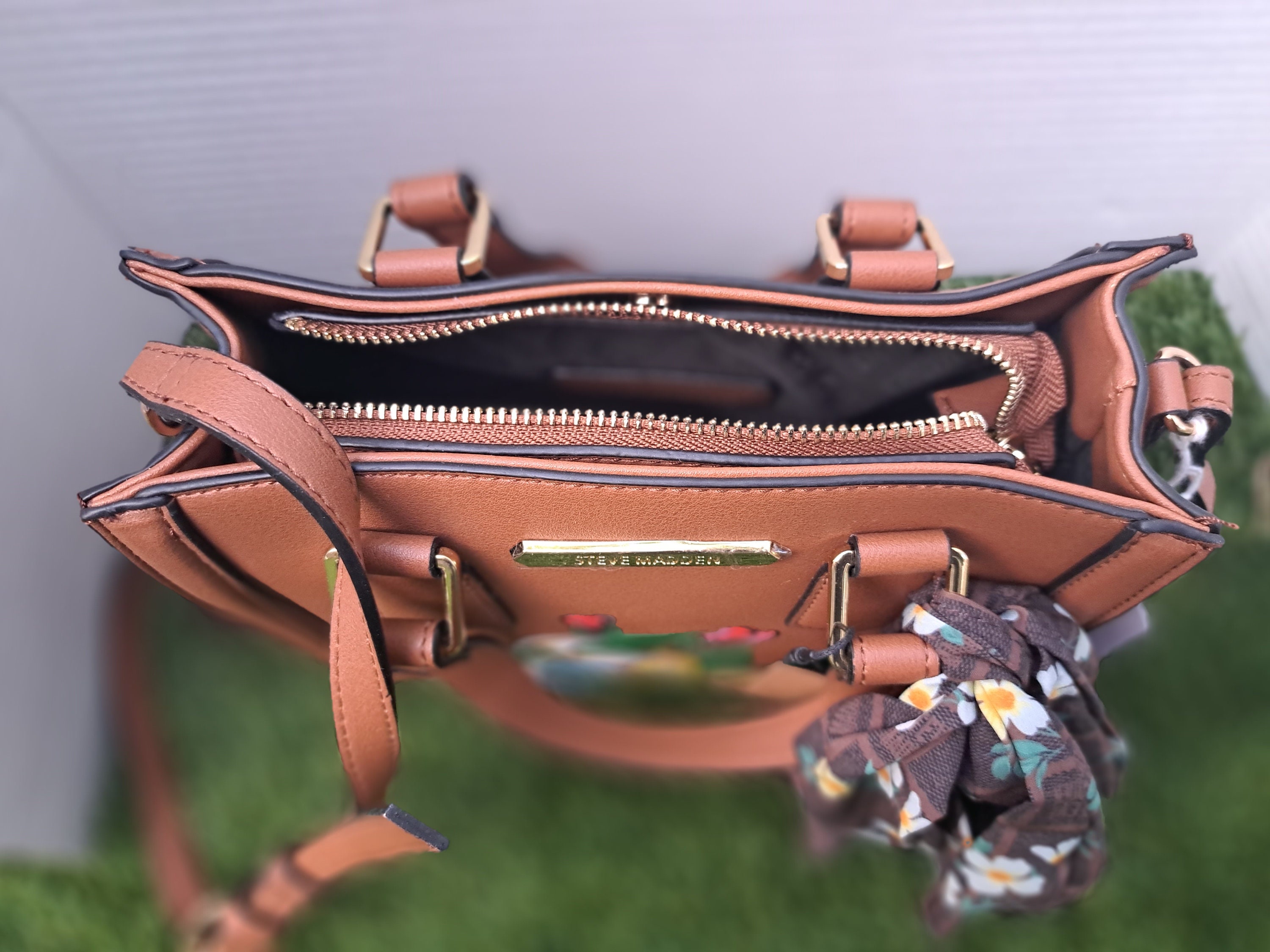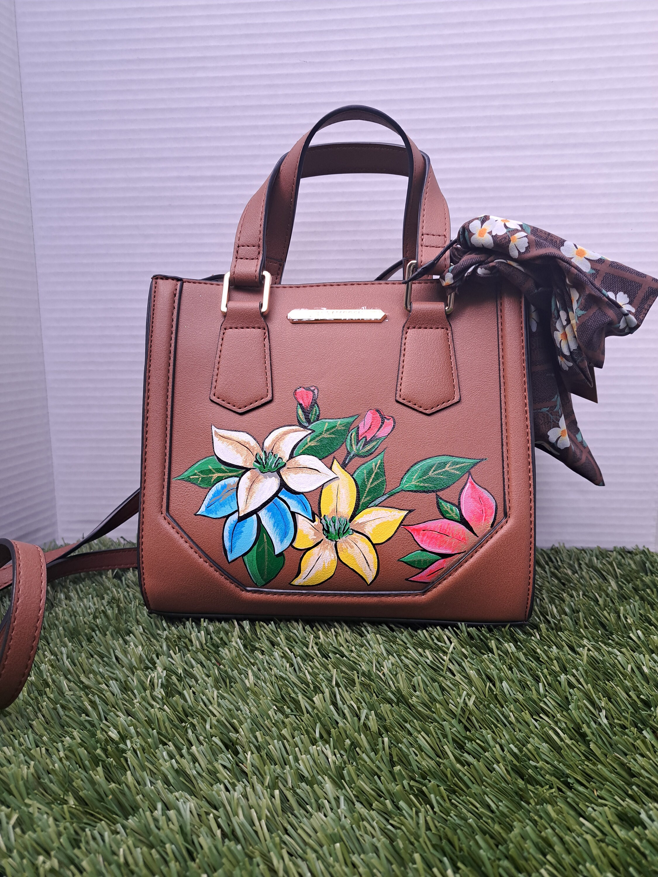 Crafted with the utmost care, this Flower Handbag is made with high-quality leather and a Steve Madden Leather bag, ensuring durability and longevity. The leather handbag features a cognac color that complements the painted spring flowers perfectly, making it an ideal spring designer bag.