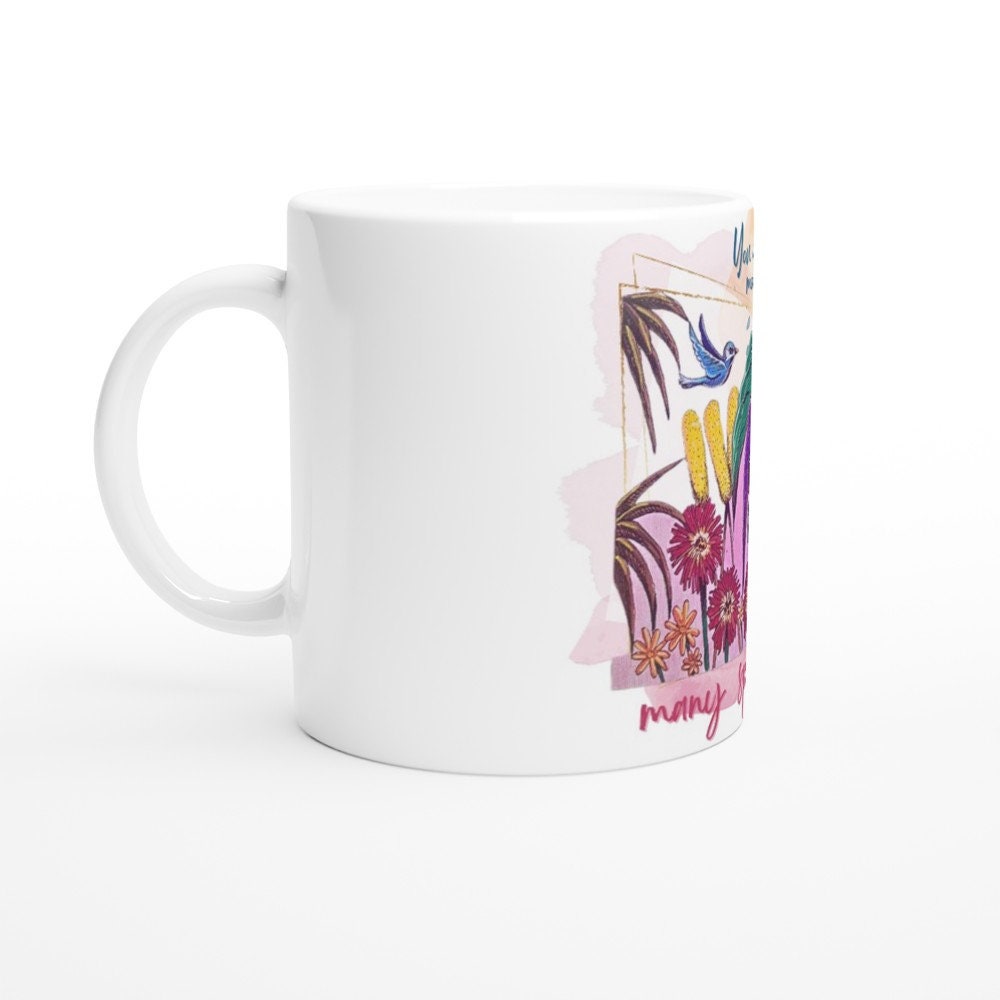 This beautiful ceramic mug is perfect for any event of the day. Your morning coffee, a hot chocolate, or any other hot beverage you enjoy. The mug is glossy white and the prints come out beautifully and vividly on it. The print retains its quality and luster when used in both microwaves and the dishwasher.