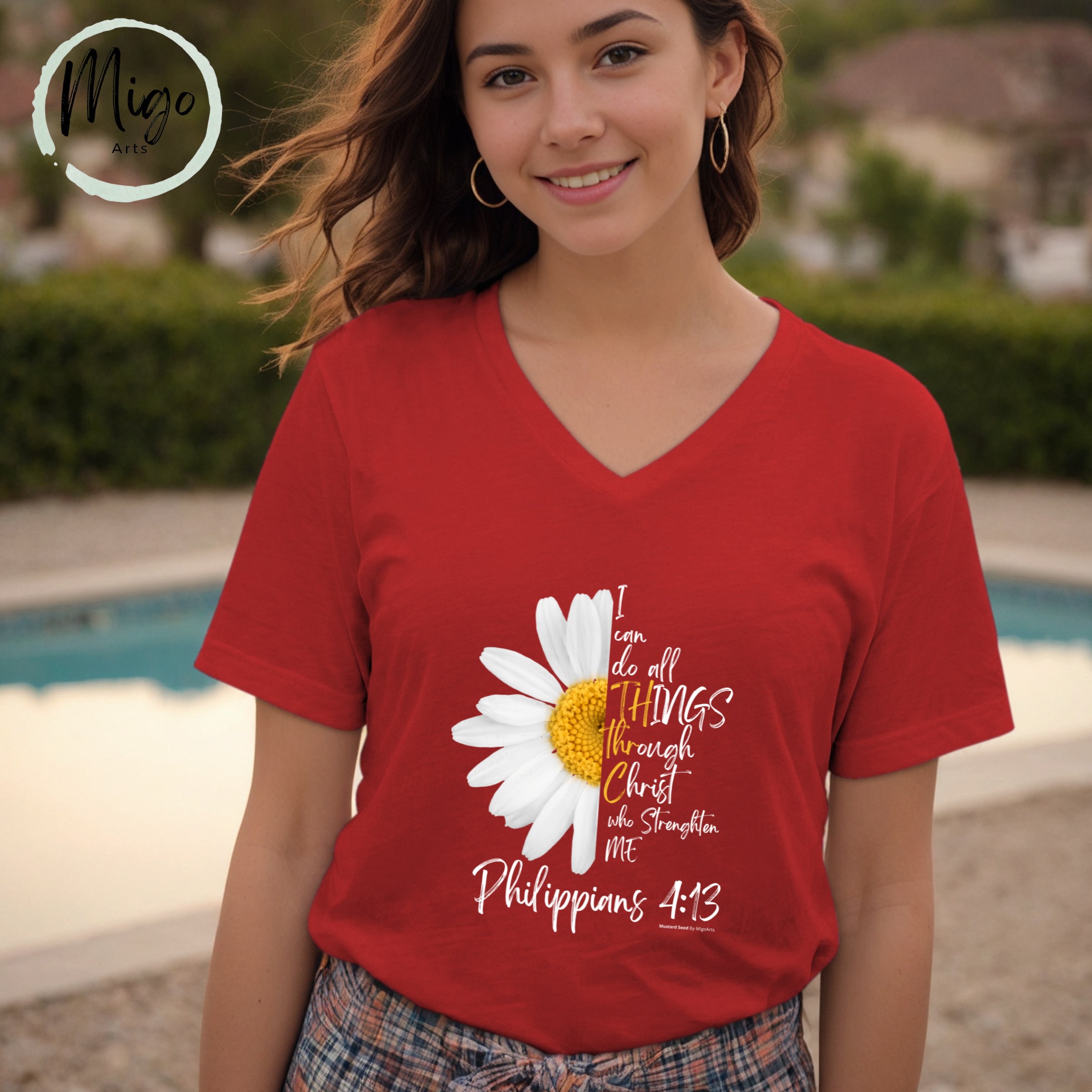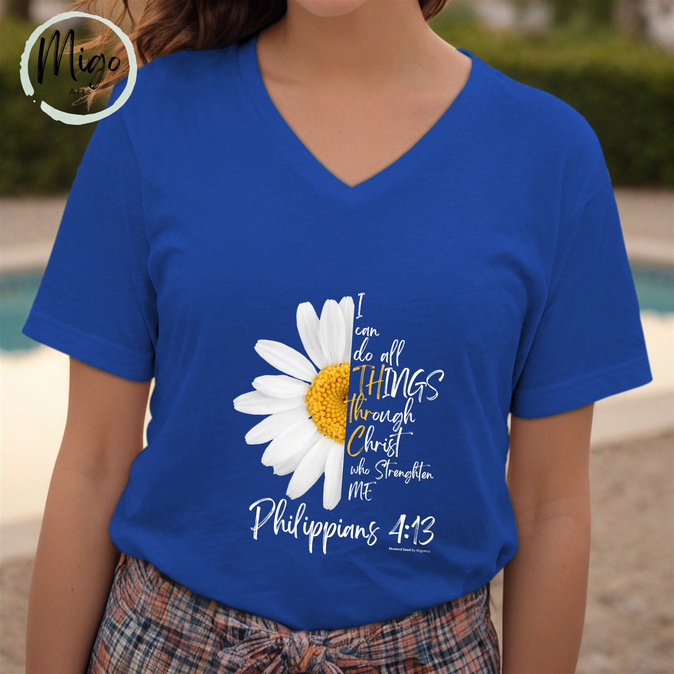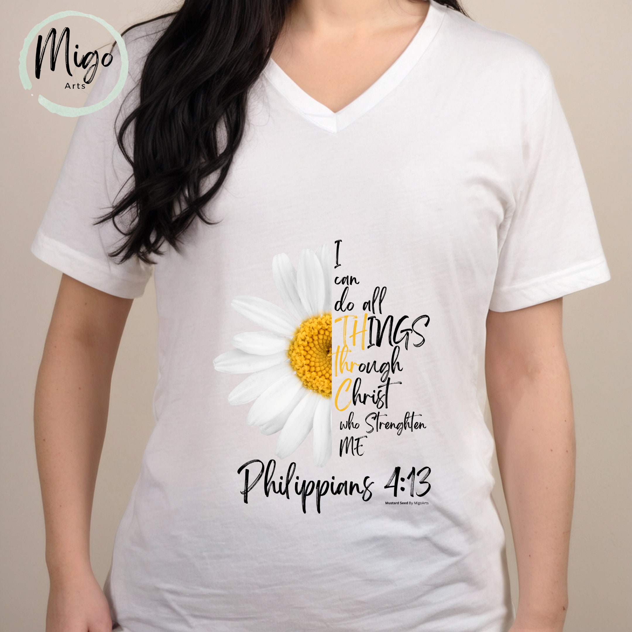 The 100% Cotton V neck with the " I will do all things through Christ " is the T-shirt you want to face your world everyday