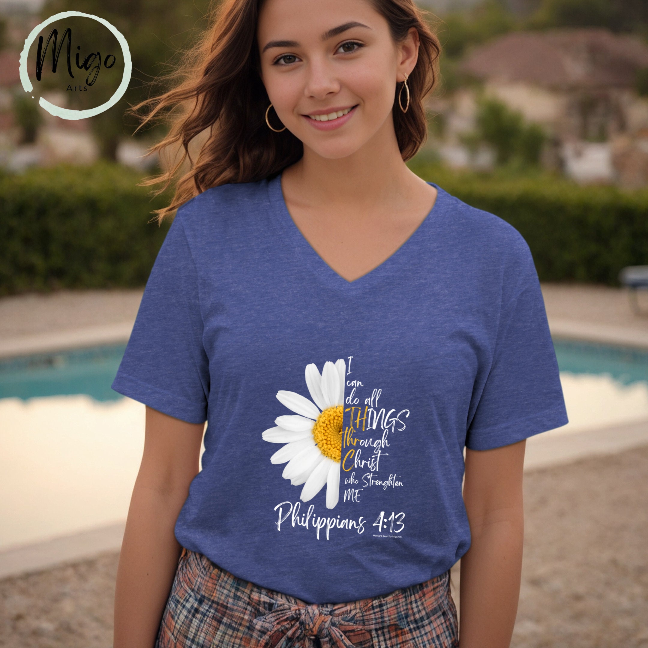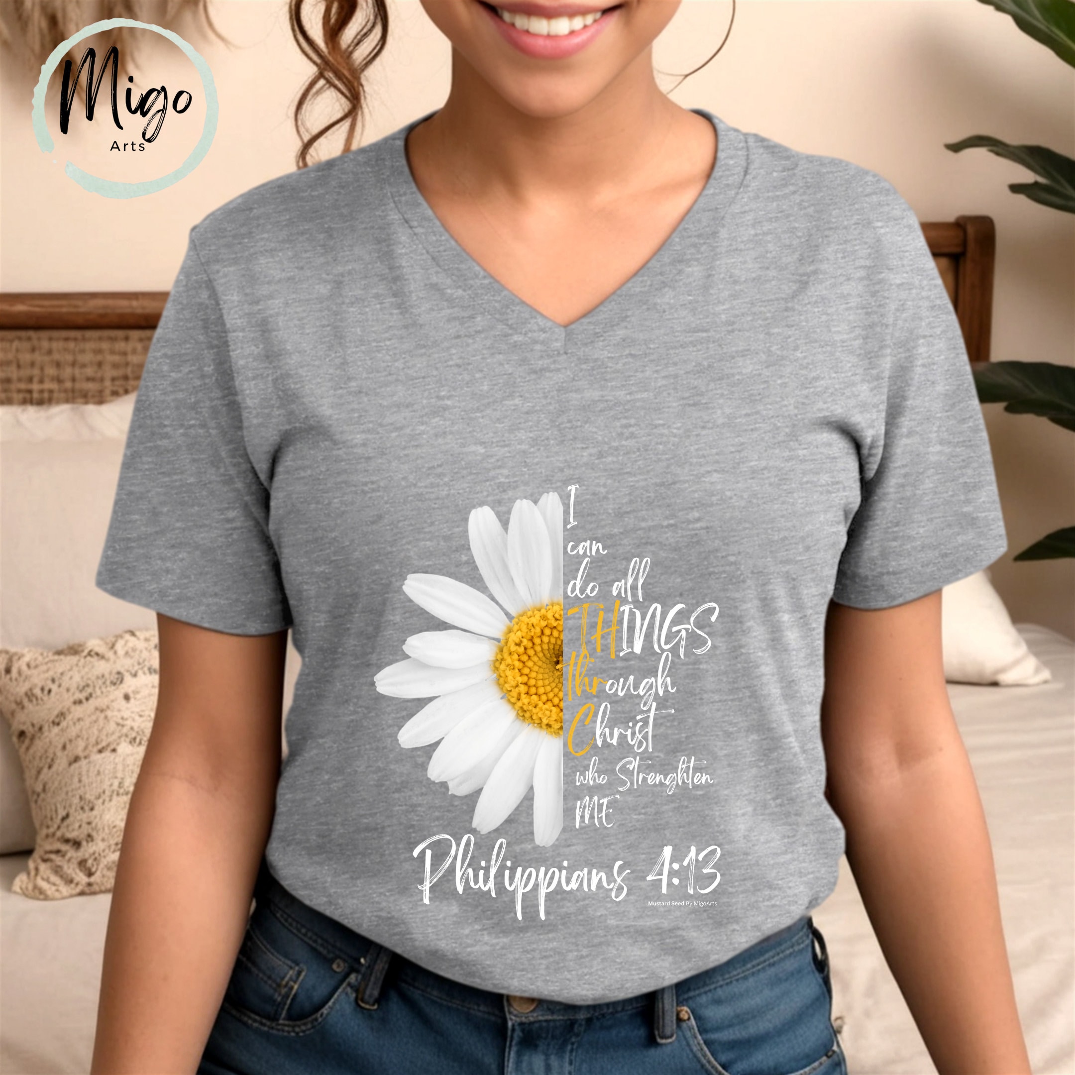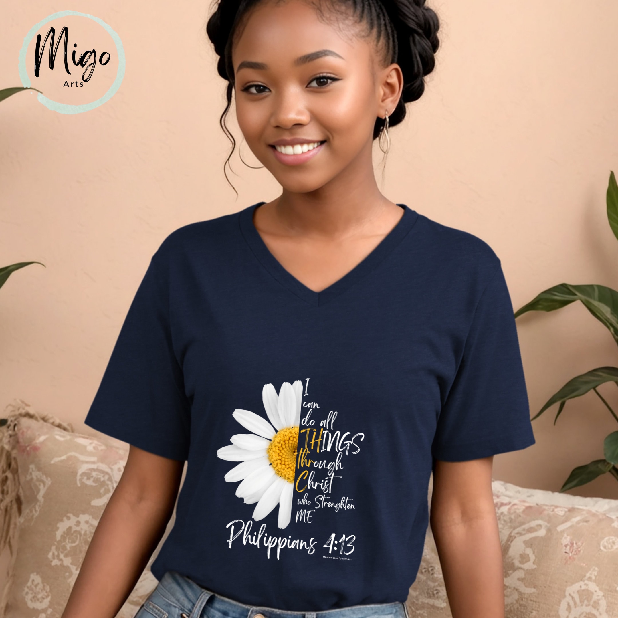 The 100% Cotton V neck with the " I will do all things through Christ " is the T-shirt you want to face your world everyday